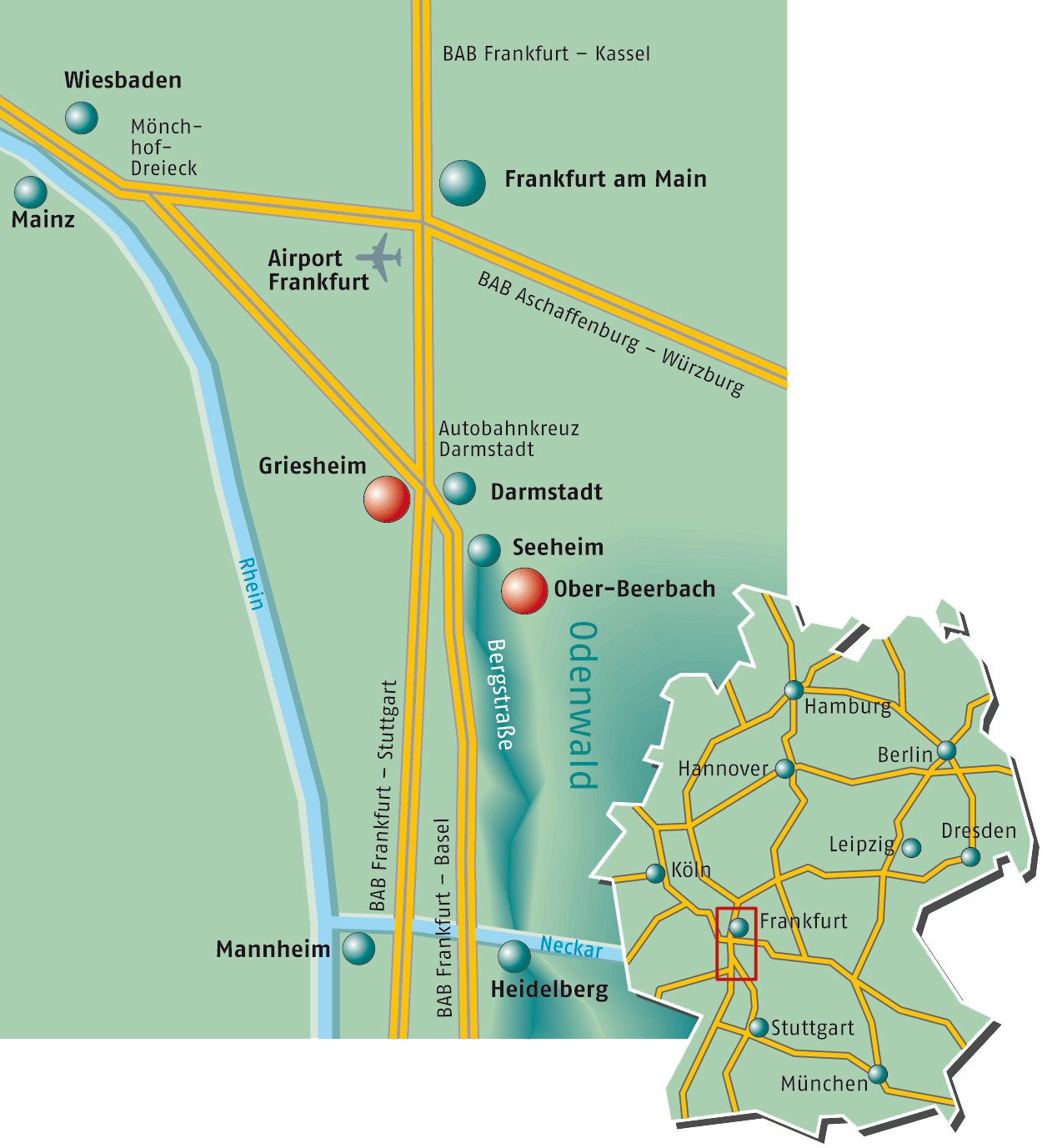 Die Stadt Griesheim liegt direkt vor den Toren Darmstadts inmitten des Rhein-Main-Gebiets mit unmittelbarer Anbindung an das Autobahn-Kreuz A5/ A67. Die zentrale Lage bietet kurze und schnelle Auffahrtswege zu den umliegenden Metropolen wie z.b. Frankfurt am Main - Wiesbaden - Mainz - Mannheim - Heidelberg die alle im Umkreis von maximal 50 Km liegen. Das nur circa 30 Km entfernte AB-Kreuz A5/ A3 bietet weitere hervorragende Verkehrs- anbindungen. Der am Frankfurter AB-Kreuz gelegene Rhein-Main-Airport ist ebenfalls in nur 15 Autominuten zu erreichen. Abgesehen von der optimalen Lage in Bezug auf Verkehrsanbindungen ist es nur ein Katzensprung in den nahegelegenen Odenwald.